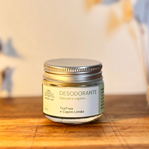 Composição (em português): Manteiga de Cupuaçu, Óleo Vegetal de Girassol, Óleo Vegetal de Coco, Cera de Carnaúba, Amido de Milho, Bicarbonato de Sódio, Zeolita, Vitamina E, Óleos essenciais de Tea Tree e Capim Limão.